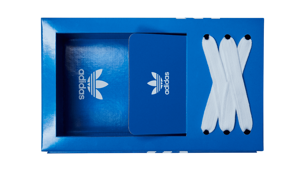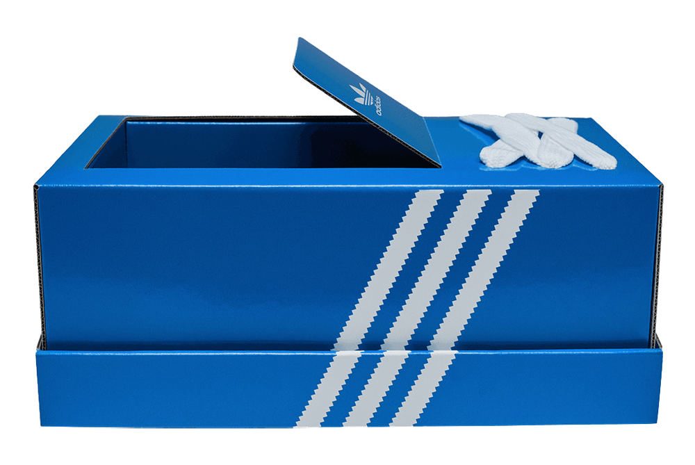 Spotted on sneaker fans including Sallyssneakers and Futurist, The Box Shoe takes direct inspiration from the classic Adidas blue striped shoe box design.