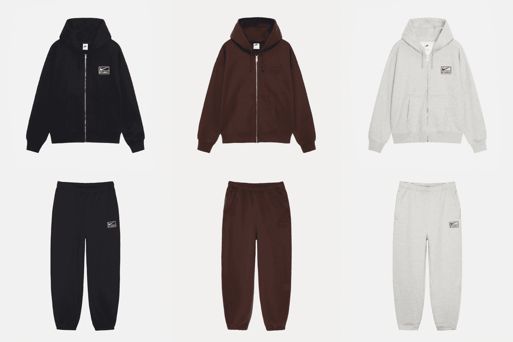 Nike and Stüssy take the zip-up route with their latest round of boxy, oversized hoodies and matching sweatpants, which are available in black, grey, and a “collaboration-first” shade of deep brown.