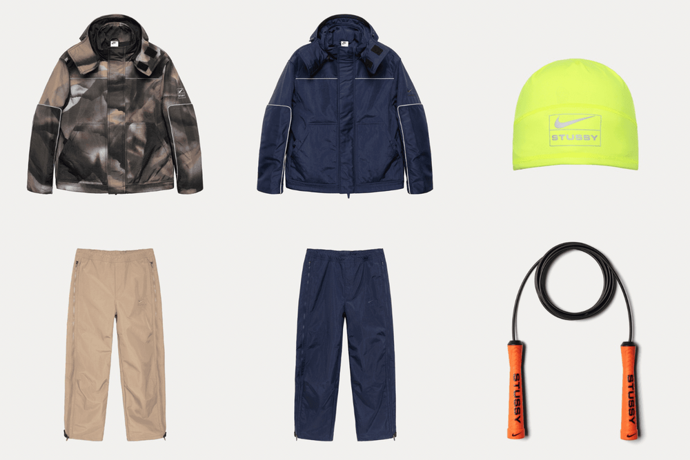 The rest of the capsule is comprised of Nike x Stüssy skullcaps in black or neon green, alongside nylon track pants with tonal branding and full-length side zips, plus a rare accessory example — materialised in the form of a usable Nike x Stüssy skipping rope.