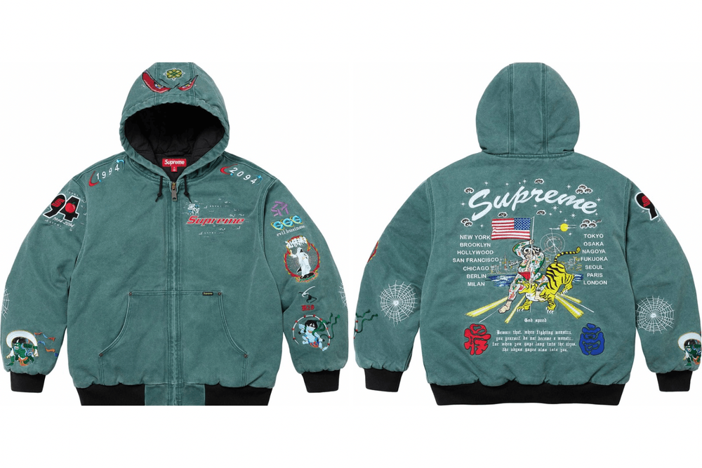 Aside from its big name team-up with Nike SB that slightly tweaks the Nike Air Darwin to better suit contemporary skateboarding criteria, Supreme is also taking input from AOI Industries, the embroidery specialists hailing from Japan who showcase their talents on work jackets and zip hoodies.