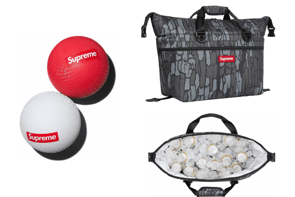 Dropping alongside the awaited selection of tops, Supreme’s final injection of branded accessories arrives in the form of red or white “Playground Balls”, made in collaboration with Franklin, plus bark-camo satchels with insulating properties for a carry-all cooler that can hold up to 24 cans of your desired beverage.