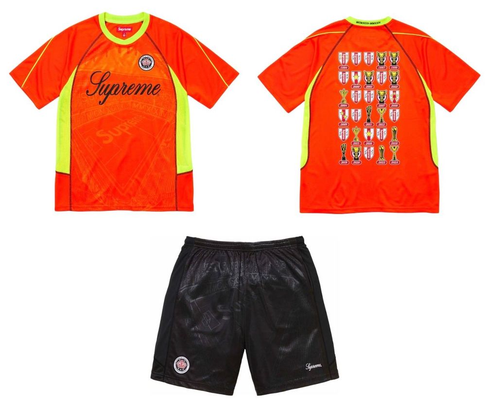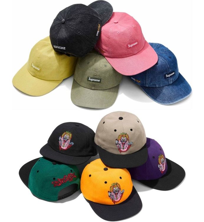Hat styles include a simple array of cotton denim/ Cordura blend 6-panel caps, in addition to the clown design that comes in six colourways, with no discrepancies in regards to rear branding or brim colour. Last but not least, Supreme has put together a football kit combination, available in black, red or blue with matching shorts.