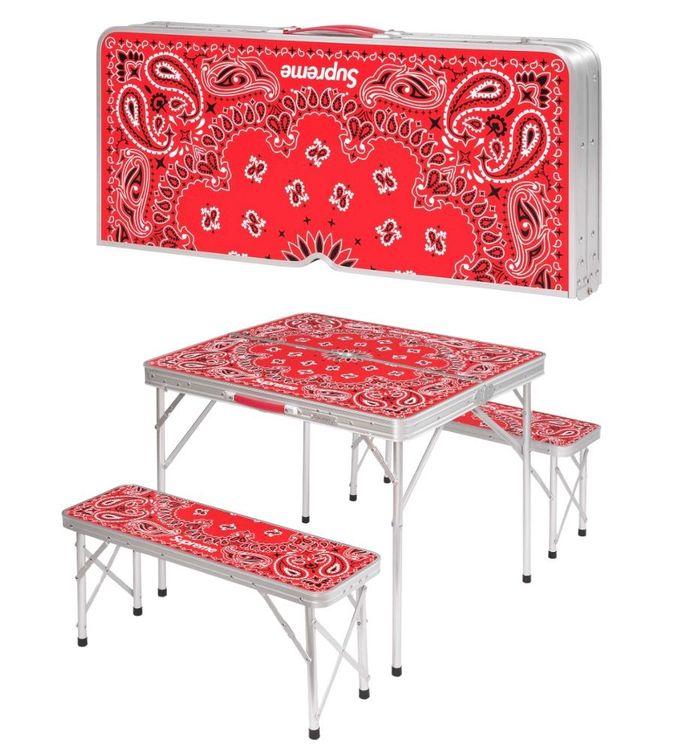 In what’s shaping up to be a perfect week for the cookout-frequenters in the Supreme community, the final accessory is a folding table set produced by Coleman that comes with two matching benches, finished with engraved metal badges on the sides.
